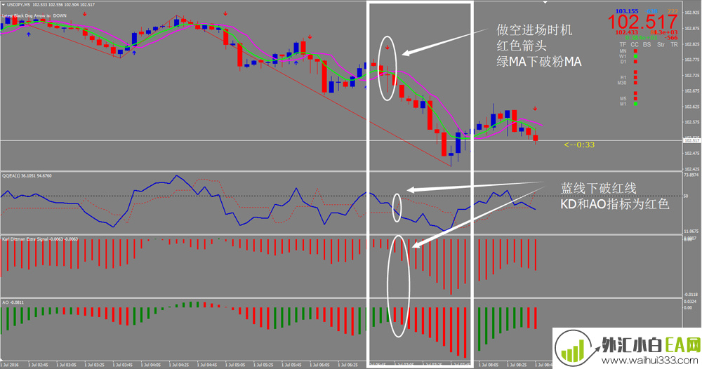 2.做空时机:绿色移动平均线(MA)下破粉色移动平均线(MA),向下箭头出现,QQE蓝实线下破红虚线。KD指标为红色,AO指标为红色。