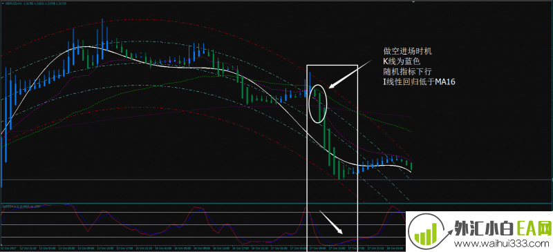 2. 做空时机:K线蜡烛图为绿色;KDJ随时指标下行;I线性回归指标的白线下穿移动平均线(MA16)粉色线。
