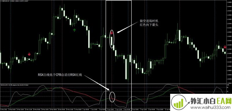 2.做空时机:K线图上出现红色向下箭头;下方指标中RSX白线低于CFB自适应的RSX红线。
